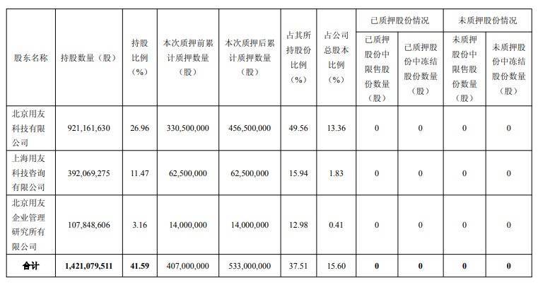 北京用友科技及其一致行动人合计持股41.59%,本次质押后累计质押5.33亿股,占公司总股本15.6%。