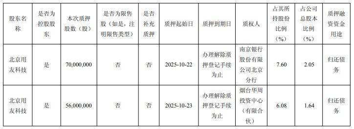 2025年10月23日,公司控股股东北京用友科技将其持有公司56,000,000股无限售流通股质押给烟台华周投资中心(有限合伙),股份质押登记手续已于2025年10月24日办理完毕。