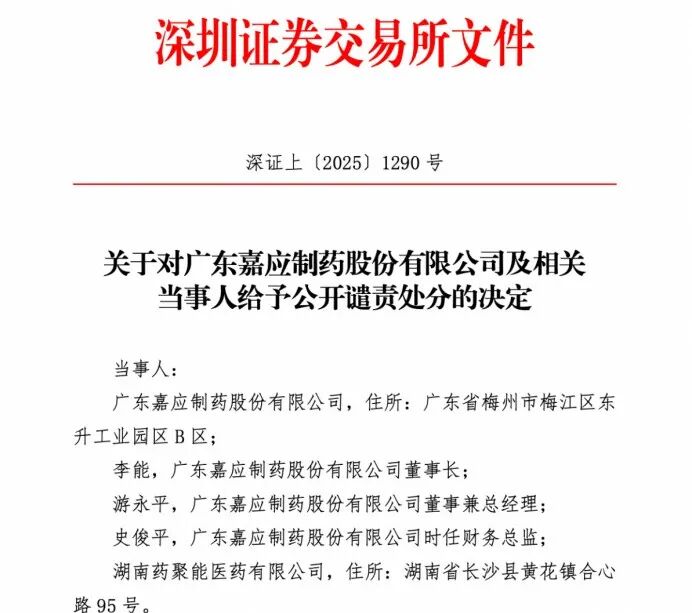 与此同时,广东证监局、深交所分别对嘉应制药、李能、游永平、史俊平以及时任董事会秘书肖巧霞出具警示函、监管函。深交所还对嘉应制药、李能、游永平、史俊平以及湖南药聚能医药有限公司给予公开谴责处分,其中湖南药聚能医药有限公司(简称“药聚能”)的实控人正是嘉应制药董事长李能。